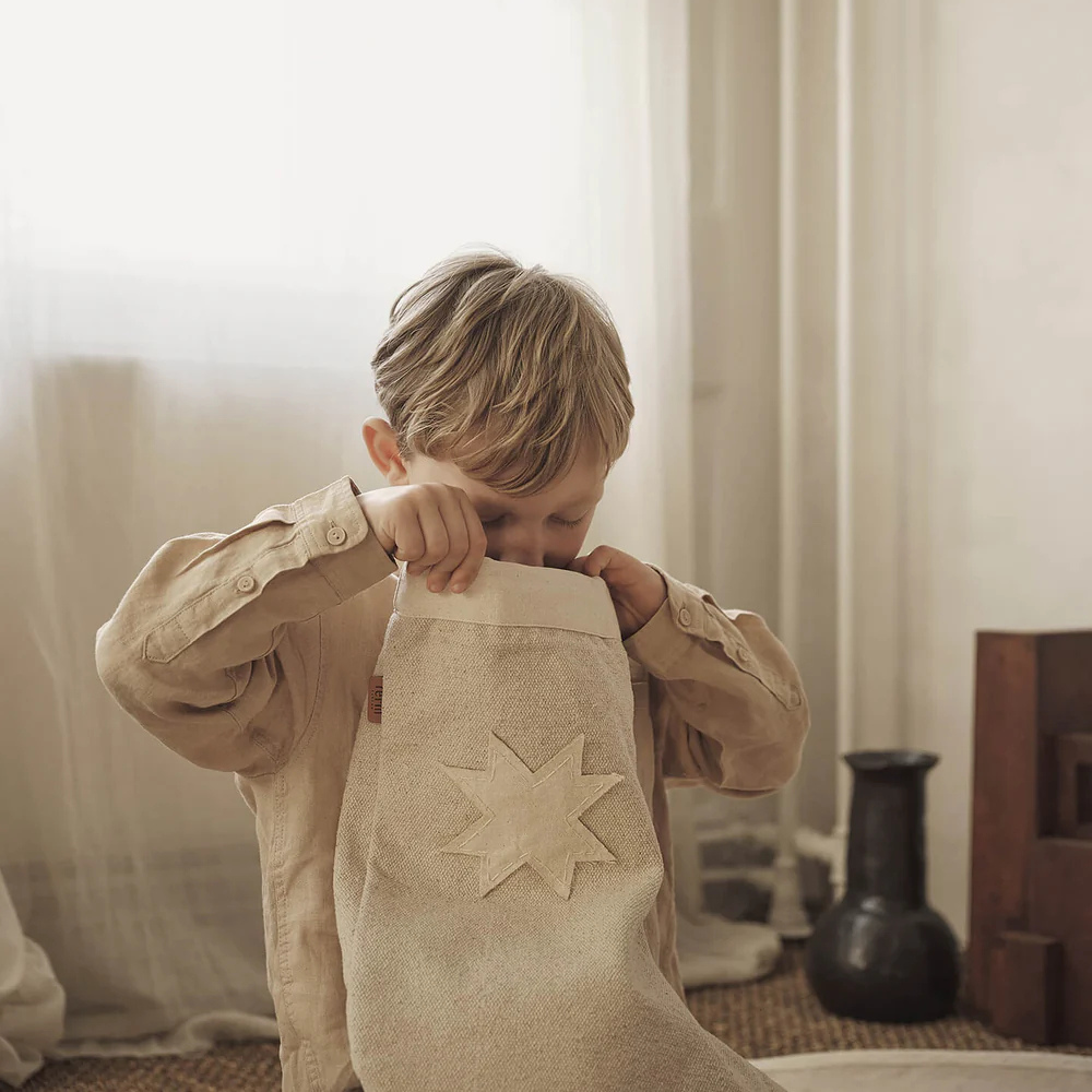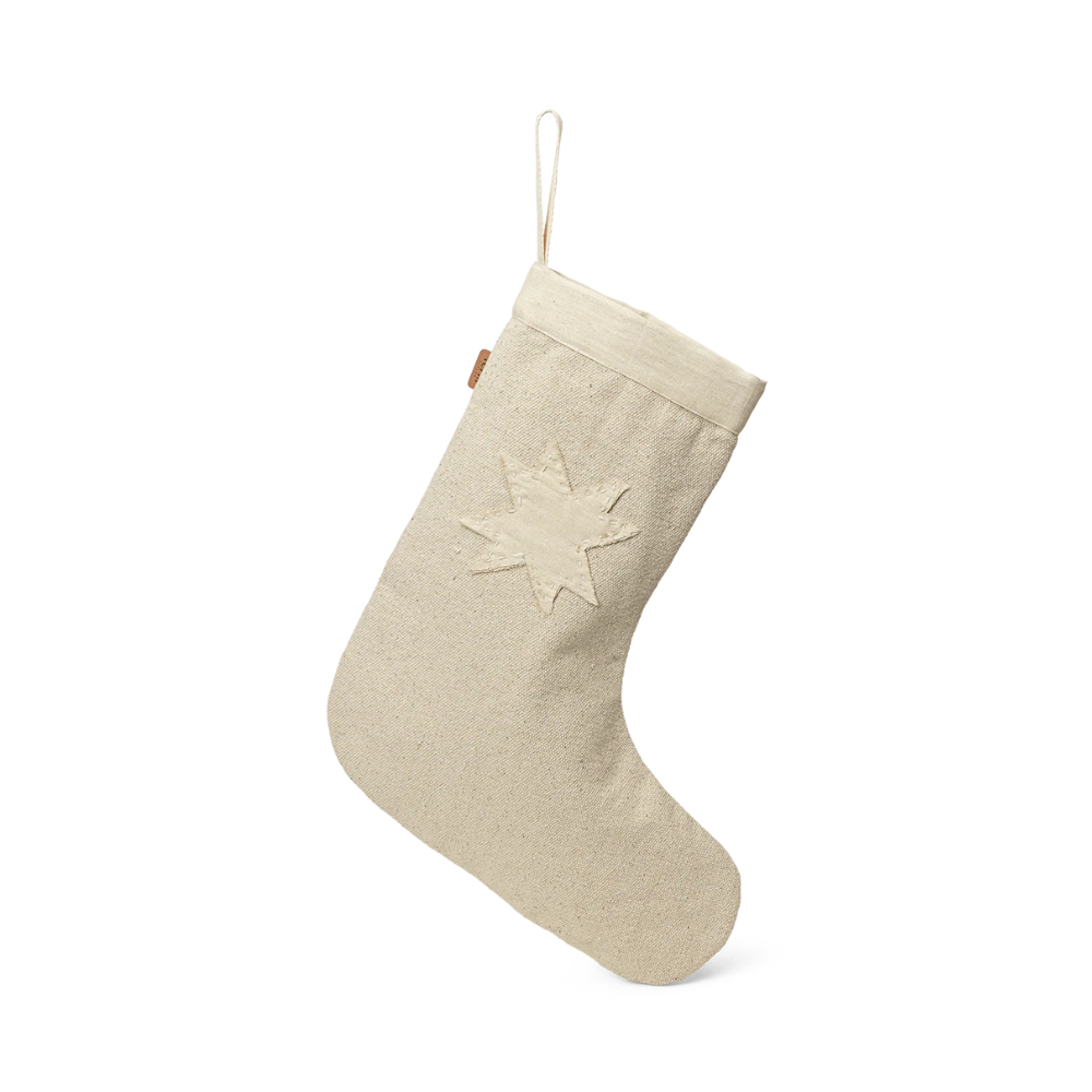 Carefully crafted from natural, undyed GOTS-certified cotton canvas, the Vela Stocking has a carefree, naïve expression that recalls the nostalgia of homemade Christmas decorations. A beautiful, double-layered cotton canvas star has been appliquéd by hand onto every stocking, providing each one with a lovely, unique detail. The edges of the star have been left frayed, underscoring the relaxed, tactile feel of the material. Hang the Vela Christmas Stocking above your fireplace, on a doorknob or on the railing of your stairs to provide the holiday season with an organic yet festive touch.