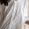 This oversized fit features a Grandad style collar, half placket up the front and button up cuffs on long sleeves. Finished with mother of pearl buttons sewn with a contrasting red thread. A nod to the vintage piece.
