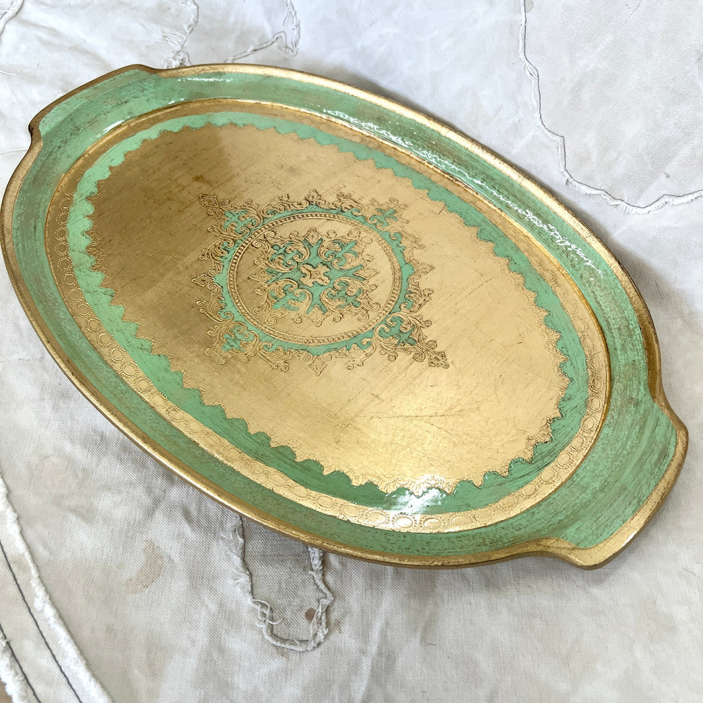 This large oval tray with green and gold design measures 53.5cm long (44cm internal surface) x 34cm wide (29cm)